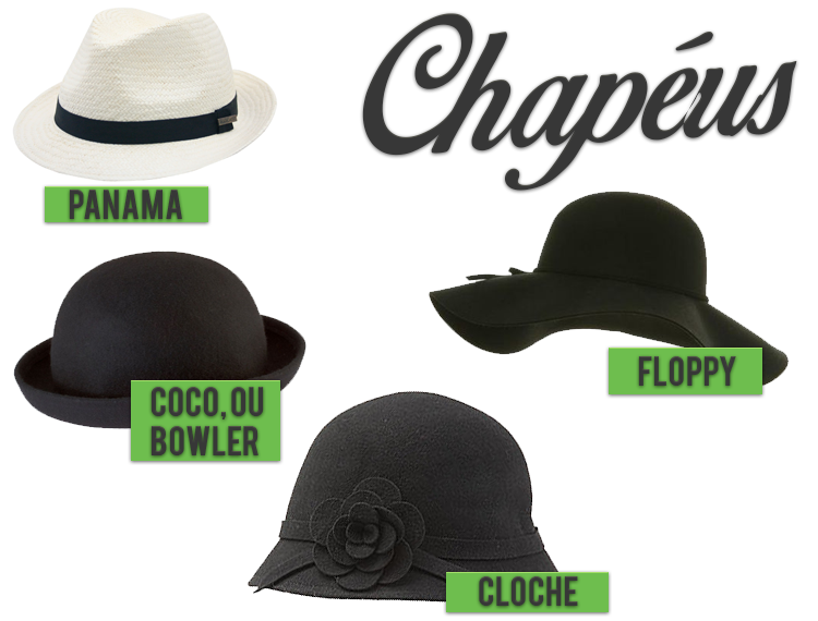 Entre os mais populares estão os chapéus estilo Floppy, Coco/Bowler, Panamá, Cloche.